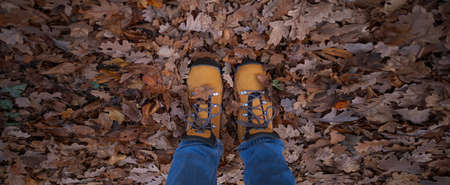 Conceptual image of female legs in yellow trecking boots on the autumn leaves. Feet shoes walking in nature