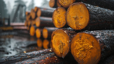 Deforestation concept - logging timber in wood industry, pile of cut off tree trunks, selective focus