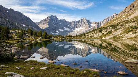 A crystal-clear mountain lake mirrors a breathtaking alpine landscape surrounded by tall trees and majestic peaks. The serene environment promotes relaxation and adventure.