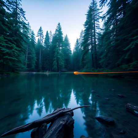 An ultra-detailed lakefront with towering fir trees and misty atmosphere.