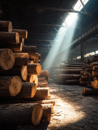 Timber logs are neatly stacked within a spacious warehouse, bathed in a beautiful beam of sunlight that enhances the natural textures and warm tones.