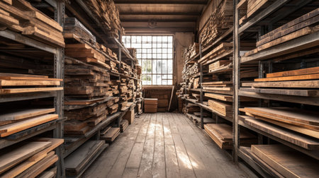 This image captures a spacious wood workshop filled with neatly organized wooden boards and lumber stacks, illuminated by natural light.