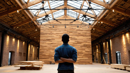 Expansive, industrial-style interior space, characterized by high wooden ceilings, large windows, and exposed brick walls. Wooden panels create a backdrop, with construction materials and equipment visible in the foreground. A person stands in the center, observing the spacious area.