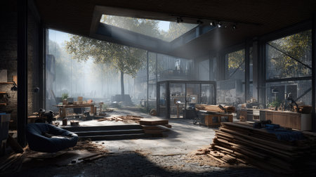 Large, industrial workshop space with high ceilings and large windows, filled with sunlight streaming in. The space shows evidence of recent or past construction activity with wood, materials, and tools scattered throughout. The ambiance is both spacious and functional.