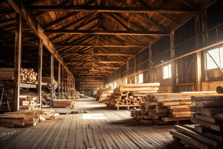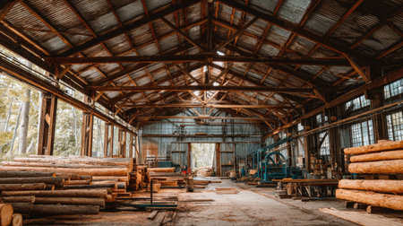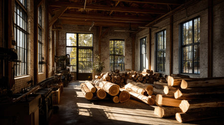 Captivating rustic interior showcasing stacks of wooden logs in an industrial mill, highlighting the blend of natural and architectural elements in a spacious setting.