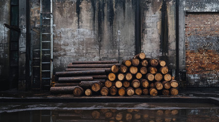 A captivating view of neatly stacked timber logs resting against an industrial wall. Reflections shimmer in a nearby water pool, highlighting the rustic charm.