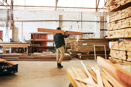 Ive built a solid base for my future in this workshop. Full length shot of a young carpenter carrying a wooden plank over his shoulder while working inside a workshop.