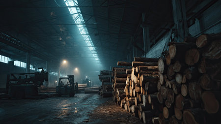 A serene view of an industrial warehouse filled with stacked logs, showcasing a forklift in action. The atmosphere blends natural materials and manufacturing processes, highlighting productivity and craftsmanship.