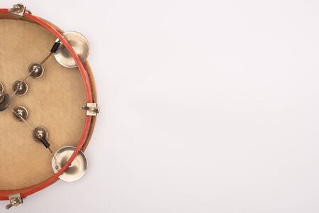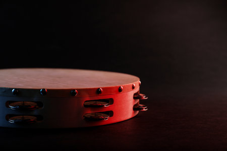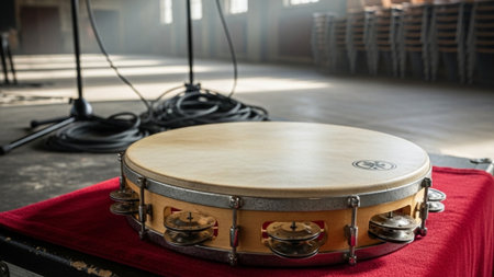 A cinematic wide shot (16:9) capturing a polished tambourine drumhead and its metallic jingles in sh