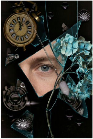Shattered mirror fragments reveal an elderly man's intense eye amid dangling antique alarm clocks, a dried rose and crystal pendants, set against a dark background with ample negative space available for text or design