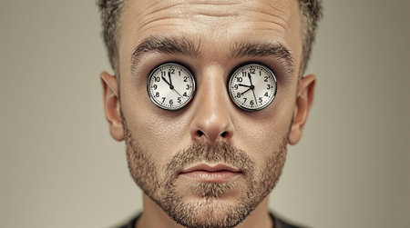 A close-up view depicts a man with his hands covering his face, holding an alarm clock. The image highlights a vintage clock and the man's hands, suggesting a mood of stress or concern. The composition has soft lighting, suggesting an indoor setting. This image could be suitable for editorial or commercial purposes.