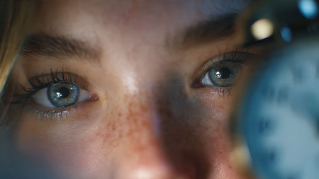 Close-up of a woman's eyes reflecting an alarm clock, conveying anxiety, insomnia, or the pressure of time passing.