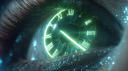 An eye is shown with a digital clock face overlayed, highlighting the concept of time. The image features a shallow depth of field, with a focus on the eye's details and the glowing clock. The color palette includes shades of blue and green, suggesting a futuristic or technological theme. Suitable for editorial and commercial use.