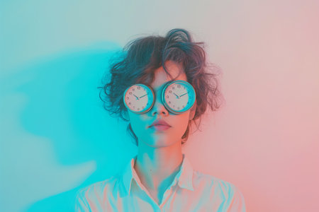 Woman with clock face projected on her, symbolizing insomnia and the passage of time. Sleep disorder concept.