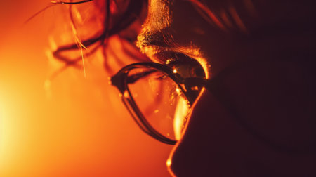 Close up portrait of a thoughtful young man wearing stylish eyeglasses, bathed in warm natural sunlight, contemplating with a focused gaze