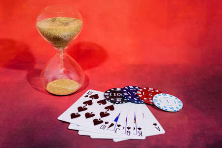 Casino abstract photo. Poker game on red background. Theme of gambling.