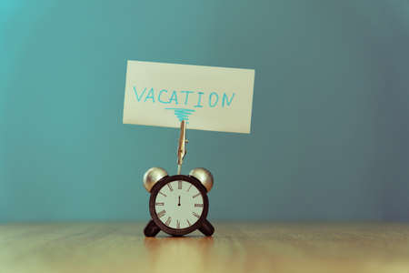 Alarm clock and banner with handwritten phrase vacation on wooden table. Vacation concept. Toned