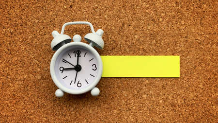 A close-up of a sticky note displaying the word time on a gray desk, accompanied by a soft-focus alarm clock and a potted plant, symbolizing productivity and reminder.