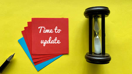 Top view of red sticky note with time to update text. With minutes glasses and yellow background.