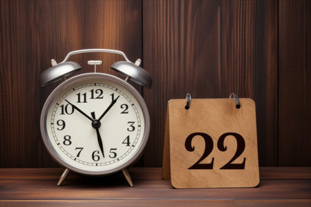 Alarm clock and banner with copy space on wooden table. Time management concept.