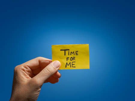 A woman holding a yellow note paper with the phrase Time for me on it in her hand over a blue sky. close up.
