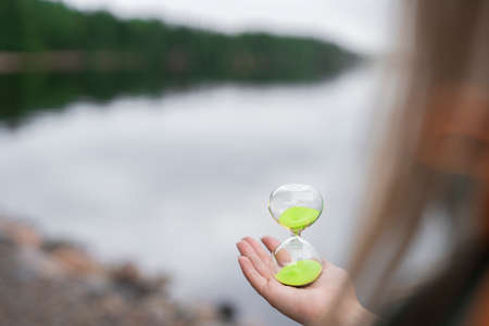 Modern Hourglass with green background -- sand trickling through the bulbs of a crystal sand glass. every second counts. symbol of time. countdown.