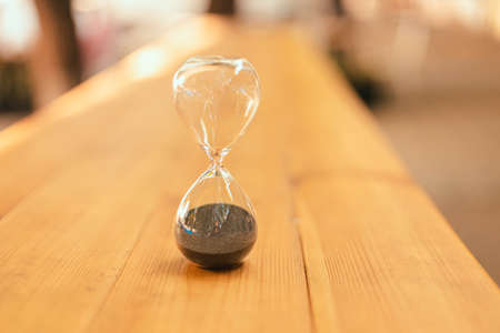 hourglass or sand clock on wooden table.