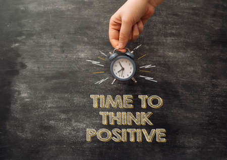 The inscription on a black chalk board - time to think positive. The girl is holding an alarm clock in her hands. The concept of thinking for personal development and motivation.