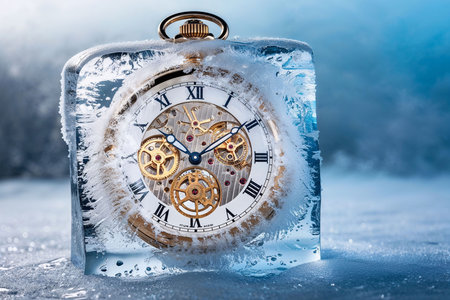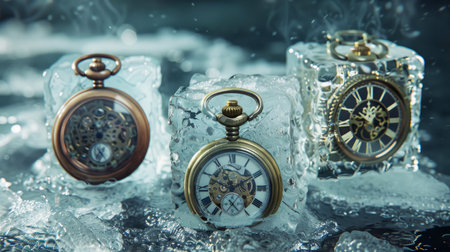 Vintage Pocket Watches Encased in Ice, Symbolizing Frozen Time and the Passage of Moments.