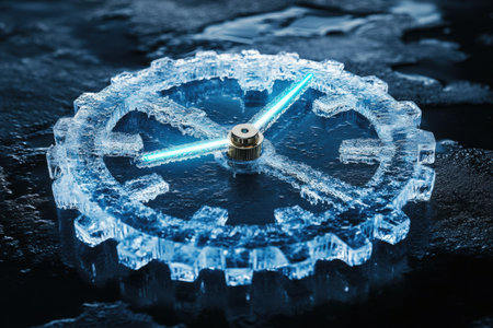 Ice gear with luminous blue highlights is positioned on a glossy dark surface, creating a striking contrast that evokes themes of time, technology, and nature's beauty
