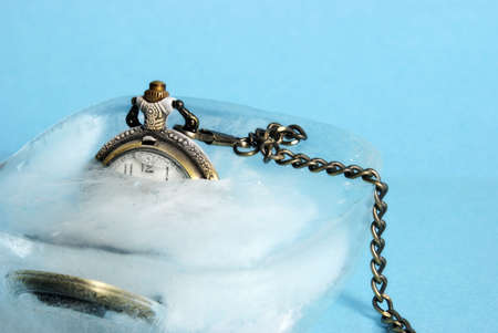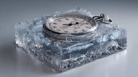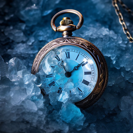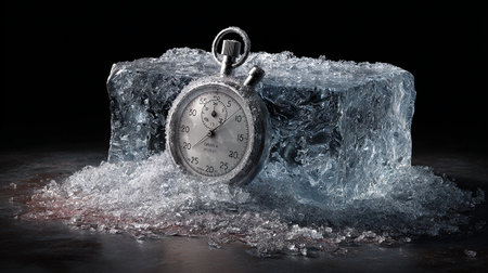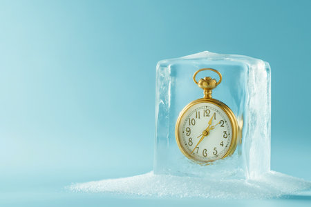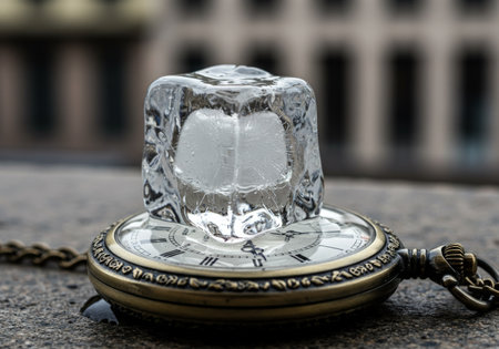 A vintage pocket watch adorned with an icy blue ice cube, capturing times frozen essence in a striking visual