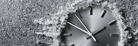 Clock face is adorned with intricate frost, showing delicate ice crystals on numbers and hands, emphasizing the chill of the winter season.