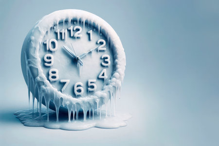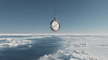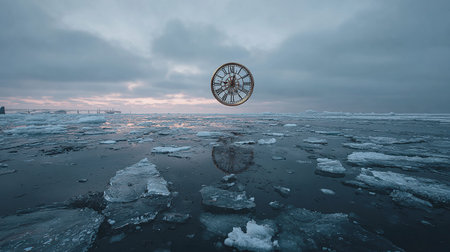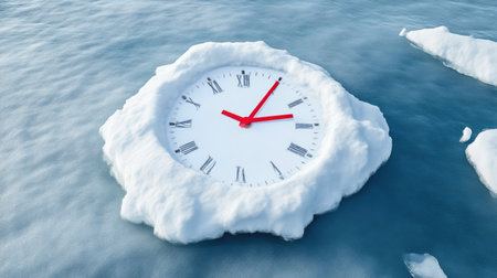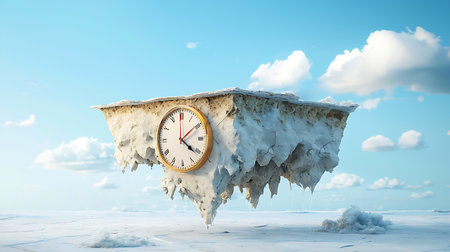 A melting iceberg shaped like a ticking clock vividly illustrates the urgent need for climate action This powerful image symbolizes our rapidly diminishing time to avert catastrophic environmental consequences The melting clock serves as a stark reminder that we are running out of time Investigate climate change's effects and act AI Generative