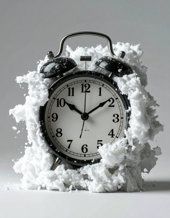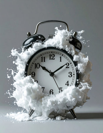 A classic alarm clock is captured in a surreal moment, partially submerged in a mysterious white foam.