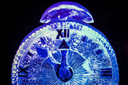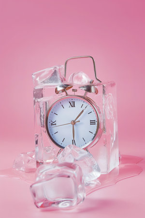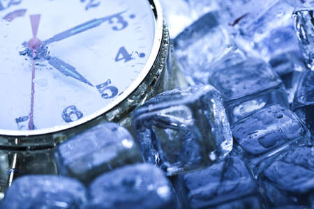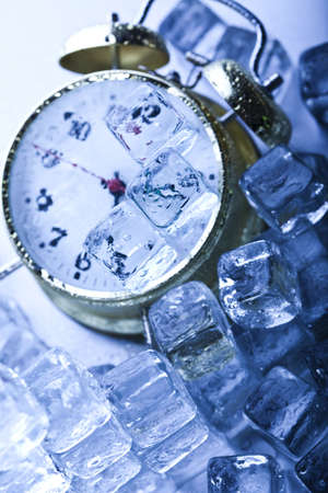 Alarm clock in ice cube, frozen time. Stopping the time concept, freeze time. Climate change. Daylight saving time, save the date, fall back.