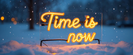 AI Generated. Neon Sign Time is Now in Snowy Winter Night Scene