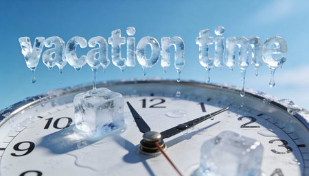 A close-up view of a clock enveloped in frost, highlighting the beauty of ice crystals and the passage of time in a tranquil winter environment.