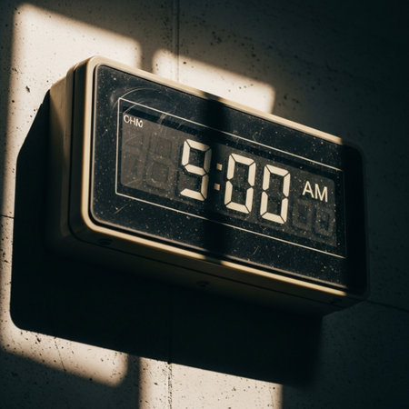 A dusty, commercial digital time clock showing 9:00 AM, lit by harsh sunlight and deep environmental