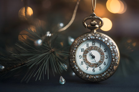 Small clock with jewelry as Christmas tree decoration. Neural network generated in May 2023. Not based on any actual scene or pattern.