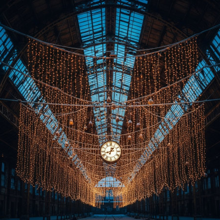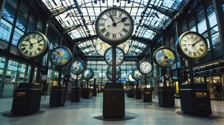 A captivating view of a modern train station featuring oversized clocks and a striking glass roof, creating a dynamic atmosphere for traveling passengers.