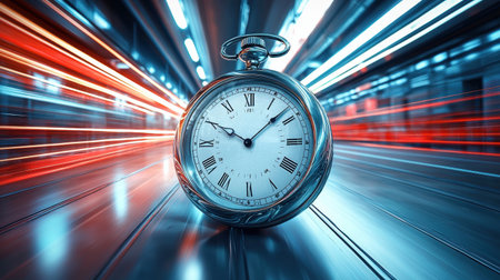 classic pocket watch is depicted as it stretches and distorts, surrounded vibrant light trails, capturing essence of time dilation and motion in captivating visual
