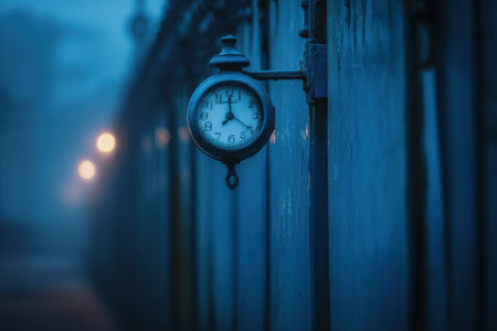 Vintage clock on a fence in a foggy, blue-toned environment.
