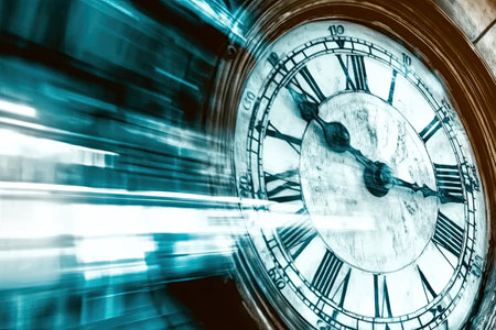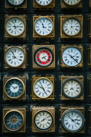 Old-fashioned clocks with Roman numerals show various times, creating a sense of timelessness and nostalgia.