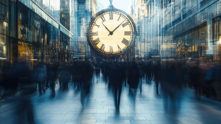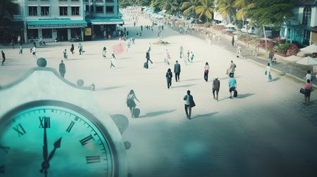 generative ai illustration of a clock over a picture of blurred people in the city, symbolizes the hustle and bustle of today's life
