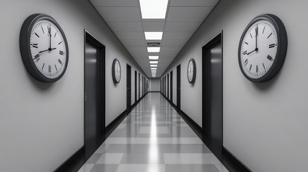A modern corridor featuring minimalist design elements, clocks on the walls, and neutral tones, creating a professional and serene environment perfect for various themes.