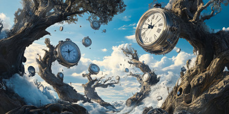 A surreal landscape where clocks melt over tree branches, inspired by the concept of time bending in a magical way