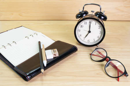 close up of calendar and alarm clock on the wooden table background, planning for business meeting or travel planning concept