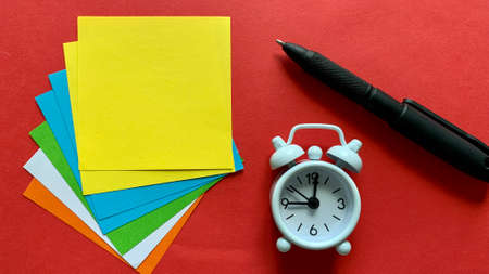 Top view of white alarm clock, notepads and pen on red background. Copy space