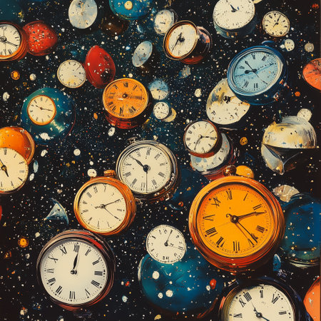 Clocks in various geometric shapes and bright colors scattered across a cosmic space, creating a surreal and abstract representation of time.