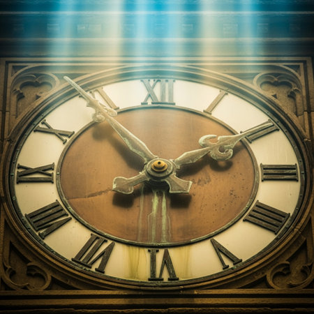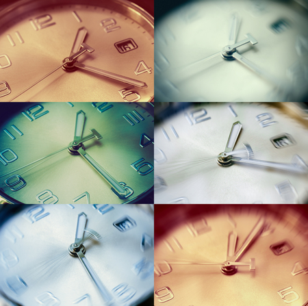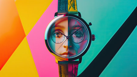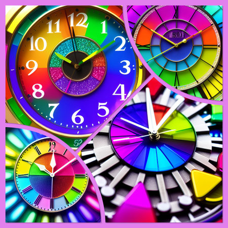 An AI generated illustration of a vibrant display of analog clocks with colored numbers